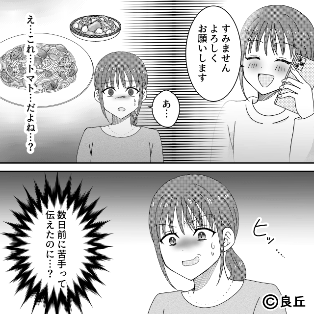笑顔で出迎えてくれた義母は、手料理を振る舞ってくれました。 しかしその料理は、主人公が苦手だと伝えていたはずのトマト料理で…。