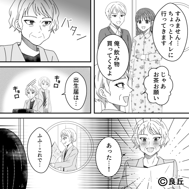 その後、主人公と夫が病室を出ると、義母は出生届を手に取り…。