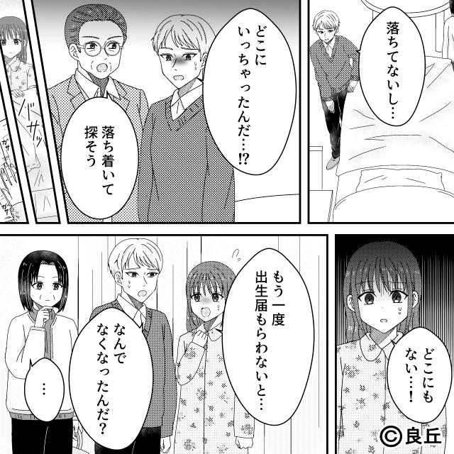 病室に両親がやってくると、義母は帰っていきました。 その後、主人公と夫は出生届がなくなっていることに気づきます。