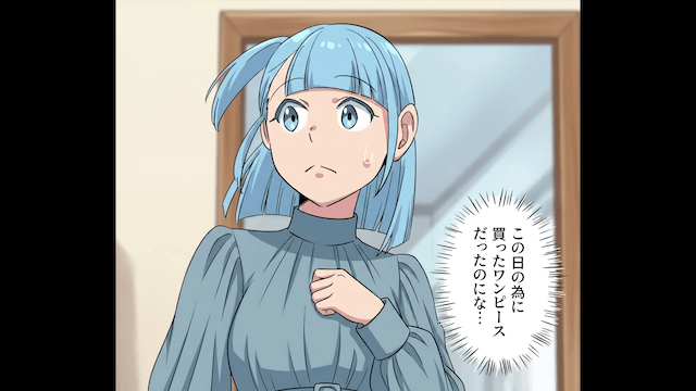 デートの日、家まで迎えにきてくれた彼氏は、主人公の服装を見てダメ出しをしてきました。 そこで主人公は「この日のために買ったワンピースだったのにな…」と落ち込みながらも、着替えることにしたのです。