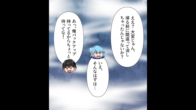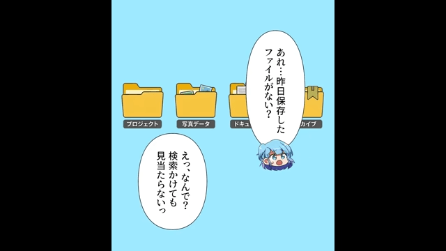昨日保存したはずのファイルがなくなっていることに気がついた主人公。 そして主人公がそのことを先輩に伝えると、先輩は「あっ、俺バックアップ持ってるからちょっと待ってな!」と言ったのですが…。