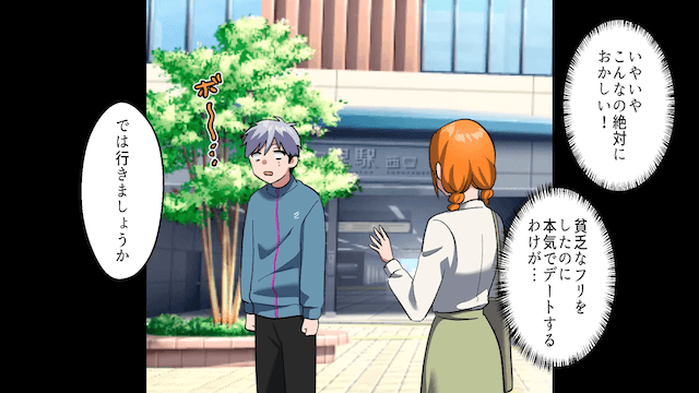 主人公が借金があると伝えても女性は引かず、結局、デートから始めることになりました。 そして数日後、主人公が待ち合わせ場所に行くと、女性は突然腕を絡めてきて…。