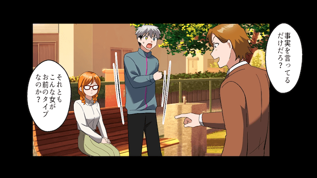 主人公が「借金の話は嘘なんだ!」と言って謝罪すると、女性は「むしろよかったです」と言ってくれました。 するとそこに兄がやってきて、主人公たちに「地味同士お似合いだな」と言ってきたのです。