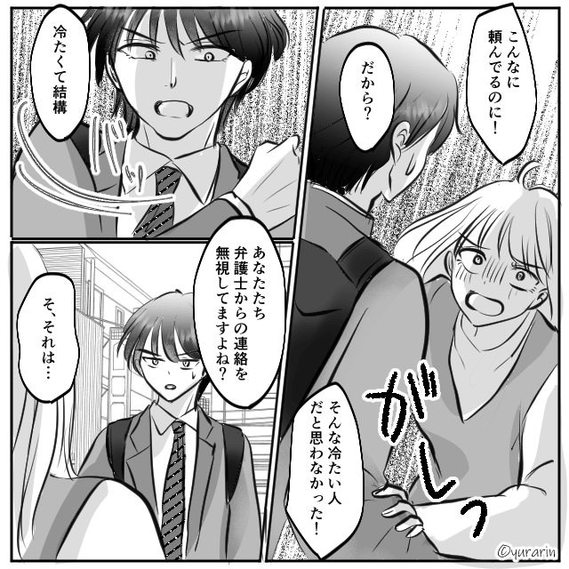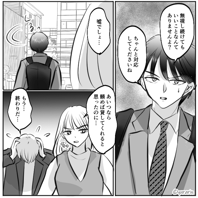 主人公が帰宅すると、マンションの入り口には妻と浮気相手がいました。 妻は「お願い!お金ちょうだい!」と涙ながらに訴えてきますが、主人公は一蹴します。