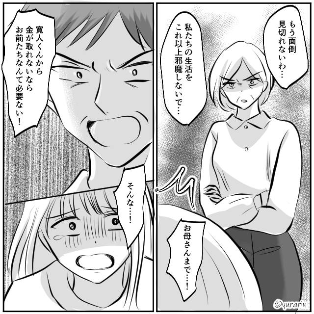 妻と浮気相手に支払いの催促を無視されたため、主人公は強制執行の申し立てをしました。 すると義両親は「うちまで差し押さえられそうなんだぞ!」と妻たちに激怒。