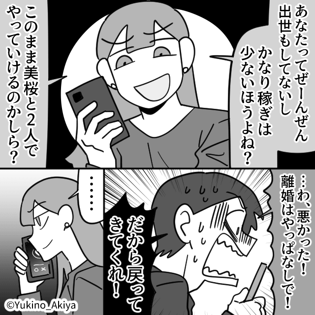 夫が「なんでこんなことに!」と困惑したため、主人公はこれまで不足分を自分が補っていたこと、さらに投資で月200万円の収入があることを明かします。 すると夫は態度を一変させ「悪かった!離婚はやっぱなしで!」と必死にすがってきたのでした。