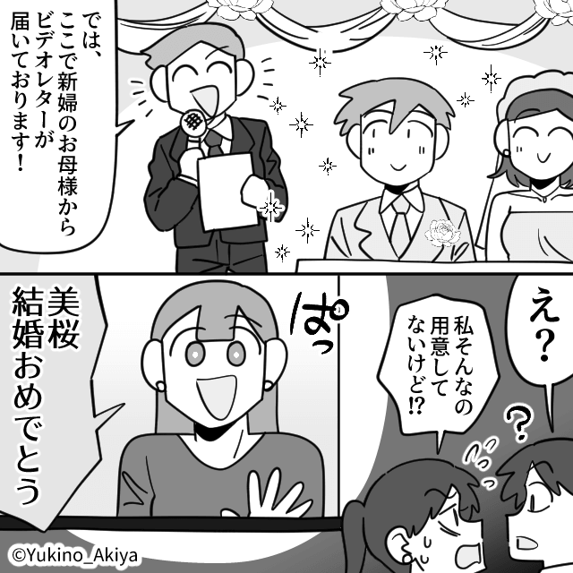 やがて披露宴が始まり、会場のスクリーンには主人公からのビデオレターが映し出され…。