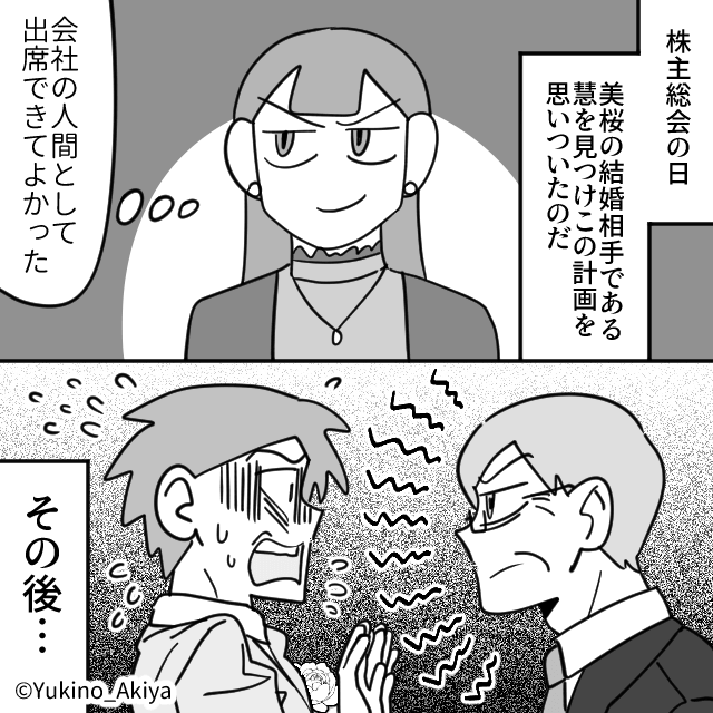 実は株主総会で娘の結婚相手の名前を見つけていた主人公は、計画を思いつき実行したのでした。